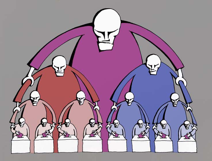 Ко контролише информације и радна мјеста, дакле, мозак и стомак, тај управља демократским процесом зарад своје добити. Ко њему није подобан, томе ће путеви ка власти и срећи бити отежани или сасвим затворени контролом над мозгом и стомаком потрошача демократије, тј. бирача. Тај ће изгубити на аудицији или се неће ни квалификовати.